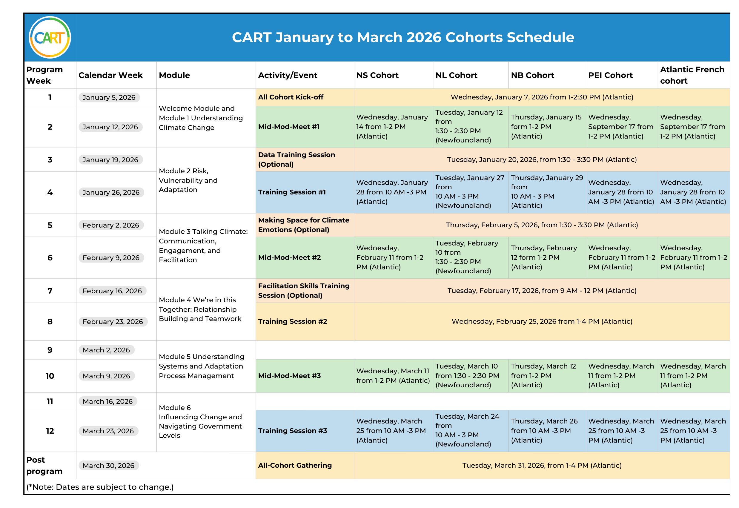 The CART program is intended for people in Atlantic Canada who want to address climate change impacts as part of their job (e.g. municipal and provincial government staff, consultants, those in non-profit or Indigenous organizations, watershed groups, and recent grads looking to enter the adaptation field, etc.).